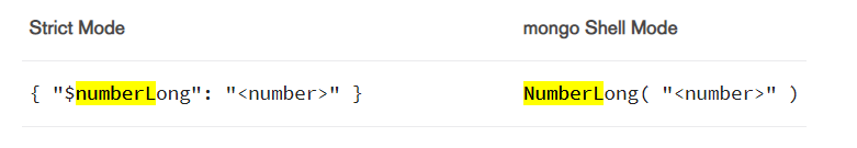 NumberLong - mongo?Shell mode. The MongoDB internal JSON parser and the?mongo?shell can parse this mode.